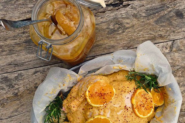 Ψητό κοτόπουλο με δεντρολίβανο, λεμόνια παστά, σκόρδο και πορτοκάλι