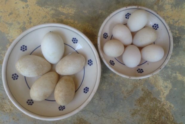 Μαζί με δύο φίλους κάναμε χτες μια πρόχειρη γευσιγνωσία. Τηγάνισα τρία από κάθε είδος και τα φάγαμε με πατάτες τηγανητές. Της πάπιας άρεσαν και στους τρεις αλλά μόνο οι δύο ενθουσιάστηκαν. Συμφωνήσαμε ότι ήταν ιδιαίτερα νόστιμα αλλά ο τρίτος είπε ότι δεν νομίζει ότι είναι πιο νόστιμα από φρέσκα χωριάτικα της κότας. Ένα ωραίο σχόλιο ήταν ότι έχουν τη γεύση που είχαν κάποτε τα αυγά της κότας. Τα φάγαμε πρώτα και ίσως αν δεν είχε ακολουθήσει η πολύ πιο έντονη εμπειρία της χήνας θα είχαμε κάνει πιο ενδιαφέρουσες παρατηρήσεις.