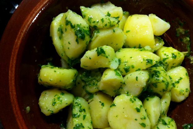 Βάζετε τις πατατούλες ολόκληρες να βράζουν τόσο ώστε όταν τις τρυπάς μ’ ένα μαχαίρι πέφτουν αλλά δεν διαλύονται (Αν δεν έχετε μικρές πατατούλες, εννοείται ότι βάζετε κανονικές κομμένες σε ισομεγέθη κομμάτια). Στο μεταξύ πολτοποιείτε στο μούλτι τις αντσούγιες με την κάπαρη, τη μουστάρδα, το σκόρδο, λίγο λεμόνι και λίγο λάδι, να γίνουν αλοιφή. Προσθέτετε τα μυρωδικά και το υπόλοιπο λάδι-λεμόνι και τα χτυπάτε προσεκτικά – θέλετε ν’ ανακατευτούν όλα τα υλικά αλλά τα μυρωδικά σας να φαίνονται.