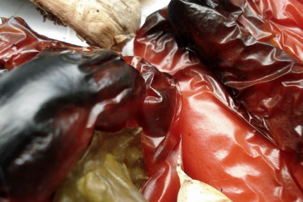 Το πολύ σε 20 λεπτά θα έχουν καψαλιστεί. Καυτές όπως είναι τις μεταφέρω σε πυρίμαχο μπολ και το καλύπτω με κομμάτι μεμβράνης ή με το καπάκι του. Οι πιπεριές θα «ιδρώσουν» και θα μαλακώσουν πολύ. Όταν κρυώσουν τελείως, τις καθαρίζω από σπόρια, κοτσάνι και φλοίδα – είναι πολύ μαλακές και, αν έχουν ψηθεί καλά, βγαίνει πανεύκολα. Τα σκόρδα τα κρατάω κατά μέρος.
