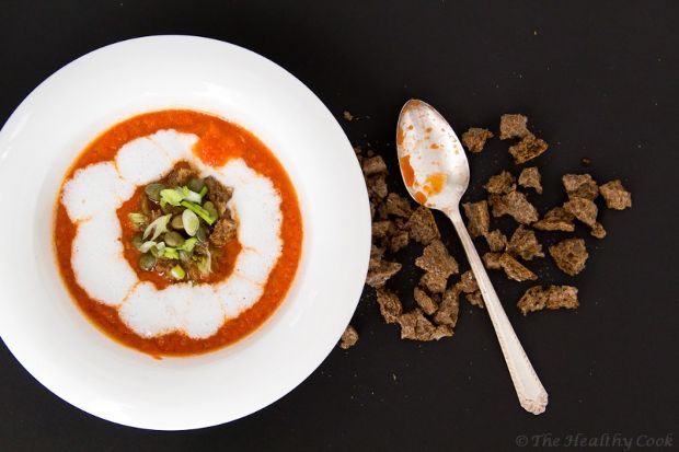 Όλα ξεκίνησαν από μια συνταγή του Ανδρέα Λαγού για γλυκόξινη σούπα ντομάτας με ανθότυρο και κάπαρη, την οποία από τότε που την βρήκα την έχω φτιάξει πολλές φορές και μου αρέσει πολύ. Όπως έχετε καταλάβει, όμως, μου αρέσει να χρησιμοποιώ μπαχαρικά στην κουζίνα μου κι έτσι είπα να την δοκιμάσω κάνοντάς την λίγο πιο πικάντικη. Επίσης δοκίμασα να περάσω τα λαχανικά για λίγο από το γκριλ πρώτα, ώστε να πάρουν λίγο πιο έντονη γεύση. Πρόσθεσα κάποια μπαχαρικά που νομίζω ότι της ταιριάζουν και αντικατέστησα το ανθότυρο με το ξινόγαλα. Μου αρέσει να το προσθέτω στις σούπες, ειδικά στις κρύες.