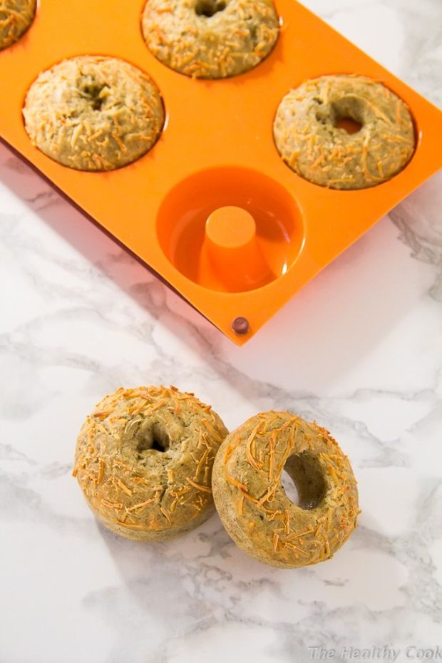 Μοιράστε τον χυλό στην ειδική φόρμα για ντόνατς, είτε χρησιμοποιώντας κορνέ με φαρδιά, ίσια μύτη, ή χρησιμοποιώντας 2 κουταλάκια. Ο πρώτος τρόπος είναι πιο «καθαρός» και γρήγορος. Πασπαλίστε τα ντόνατς με λίγο ακόμα τριμμένο τυρί και ψήστε τα 20-22 λεπτά. Δεν παίρνουν χρώμα εύκολα. Θα βεβαιωθείτε ότι είναι έτοιμα όταν πιέσετε τη ζύμη με το δάχτυλό σας και αυτή επανέλθει.