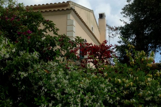 Αλλά δεν είναι μόνο τα τριαντάφυλλα: Στην Κέρκυρα συνηθίζεται μια κόκκινη μπουκαμβίλλια (τις πιο κοινές μωβ-φούξια τις βρίσκω αταίριαστες με τους ξεθωριασμένους σοβάδες των τοίχων και την ανεπαίσθητη αχλύ της ατμόσφαιρας που αμβλύνει γραμμές και χρώματα) μ’ ένα γλυκό τόνο, βαθύ μα φωτεινό. Δεν διαρκεί πολύ, μόνο μέχρι τον Ιούλιο, αλλά χαρακτηρίζει την εποχή ετούτη.