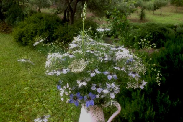 Αυτή ήταν που με ενέπνευσε να του κάνω μια σύνθεση με άλλα ονειρικά, ομιχλώδη λουλούδια στην άσπρη κανάτα απ το ΙΚΕΑ. Γελούσα μόνη μου καθώς τα έφτιαχνα με την σκέψη ότι τα τόσο ποιητικά και αιθέρια αυτά λουλούδια είχαν πολύ πεζά κοινά ονόματα όπως «αγριόσκορδο», «αγριοκαρότο» και «μαυροκούκι», απόλυτα ταιριαστά με την κανάτα της κουζίνας.