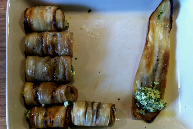 Ετοιμάζω πρώτα τις μελιτζάνες: Απλώνω τις στενόμακρες φέτες (που δεν είναι πολύ λεπτές) στο ταψί του φούρνου, στρωμένο με αντικολλητικό χαρτί, τις λαδώνω και από τις δυο μεριές με πινέλο, τις πασπαλίζω με λίγο αλάτι και τις ψήνω σε προθερμασμένο φούρνο στους 180°C μέχρι να μαλακώσουν και να αρχίσουν να παίρνουν χρώμα. Στα μισά του ψησίματος τις γυρνάω μια φορά. Πρέπει να είναι γύρω στις 15 φέτες.