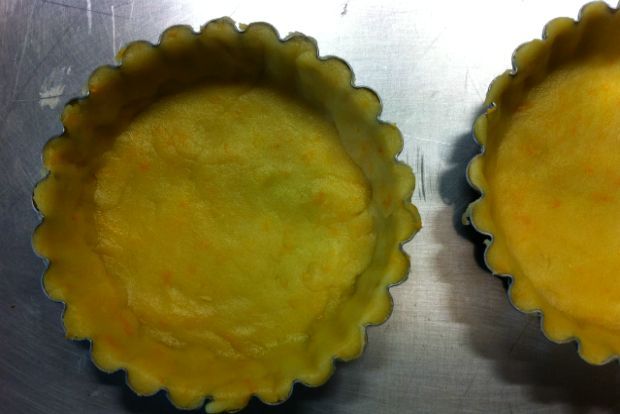 Πρώτα η ζύμη, που πρέπει να μείνει στο ψυγείο και να ψηθεί μόνη της: Τρίβω με τα δάχτυλα το αλεύρι και το βούτυρο να γίνουν σαν ψίχουλα. Ανακατεύω μια σταλιά αλάτι και το ξύσμα πορτοκαλιού. Προσθέτω κουταλιά-κουταλιά το παγωμένο νερό. Προσοχή, όχι όλο μαζί, μπορεί οι δυο κουταλιές να είναι υπεραρκετές. Το ζυμώνω ελαφρά μέχρι να γίνει μια μαλακή ζύμη την οποία τυλίγω σε μεμβράνη και την αφήνω ένα μισάωρο στο ψυγείο. Βουτυρώνω καλά μια ταρτιέρα.