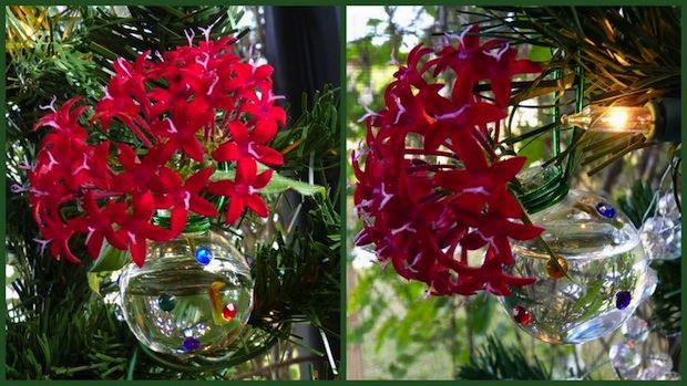 Εδώ οι διαφανείς μπάλες γεμίζουν με νερό, στολίζονται και με χρωματιστές χάντρες αν θέλετε και κρεμιούνται στο δένδρο με πολύχρωμα λουλούδια. Πλήρεις οδηγίες στο blog του Birds & Blooms.