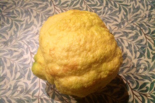 Κατ’ αρχήν κατέληξα ότι υπάρχουν δύο πολύ διαφορετικά είδη: εδώ, στην Κέρκυρα, καλλιεργείτο από παλιά ο χοντρόφλουδος κατακίτρινος στρογγυλωπός καρπός με την βλογιοκομμένη επιφάνεια, μεγάλος σαν κίτρο ή μικρή φράπα.