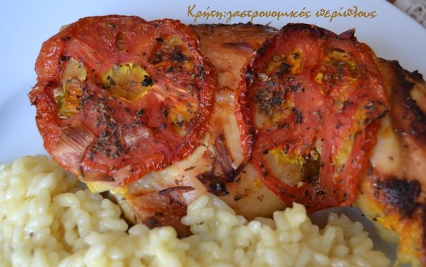 Ανάβουμε τον φούρνο στους 200 βαθμούς. Κόβουμε το κρεμμύδι σε όγδοα και το σπρώχνουμε εδώ κι εκεί στη γάστρα. Κόβουμε και τις ντομάτες σε φέτες και τις απλώνουμε πάνω από τα μπουτάκια. Πασπαλίζουμε με λίγη ρίγανη και αλάτι τις φέτες της ντομάτας.