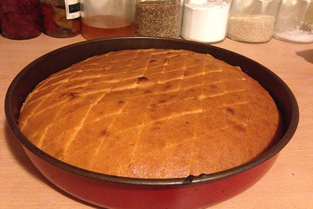 Ο φούρνος προθερμασμένος στους 270 πάνω – κάτω: βουτυρώνουμε ελαφρά ένα ταψί, κατά προτίμιση στρογγυλό και μετρίου μεγέθους, ρίχνουμε το μίγμα και το φουρνίζουμε.