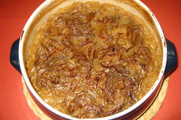 Απλώνουμε από πάνω τους τα κρεμμύδια σε παχύ στρώμα (4-5 πόντους). Χύνουμε το λάδι σε όλη την επιφάνεια των κρεμμυδιών. Σκεπάζουμε και βάζουμε σε προζεσταμένο φούρνο στους 200 βαθμούς για 15 λεπτά και μετά χαμηλώνουμε τη θερμοκρασία στους 160. Στις δυόμιση περίπου ώρες σηκώνουμε το καπάκι να δούμε τι γίνεται. (Ο κάθε φούρνος έχει τις ιδιοτροπίες του γι’ αυτό πρέπει να ελέγχουμε.) Πρέπει να έχει μειωθεί πολύ το υγρό και η επιφάνεια να έχει αρχίσει να ροδίζει.