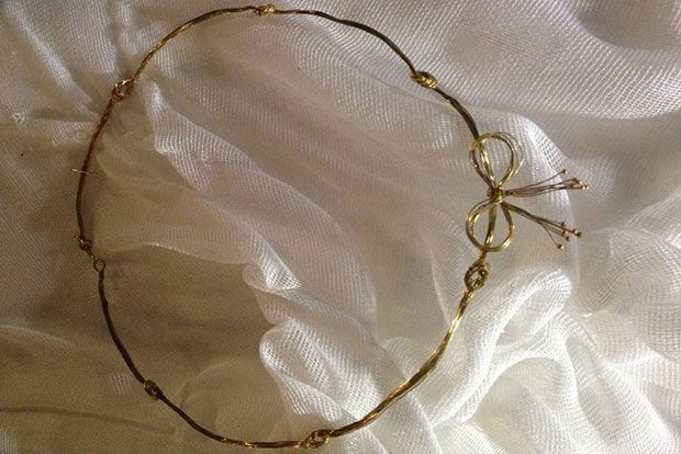 Σε έναν πάγκο διακρίνω λογιών καλούδια: Κολιέ χειροποίητα από χρυσόχρωμο νήμα, σπιτικά λικέρ διαφόρων γεύσεων και φυσικά σαπούνια από λάδι ελιάς. Ψάχνω μια ιδέα για στέφανα γάμου, έξω από τα συνηθισμένα του γαμήλιου εμπορίου, και τα κολιεδάκια μου τραβούν την προσοχή. Πιάνω κουβέντα με τον εμπορευόμενο: