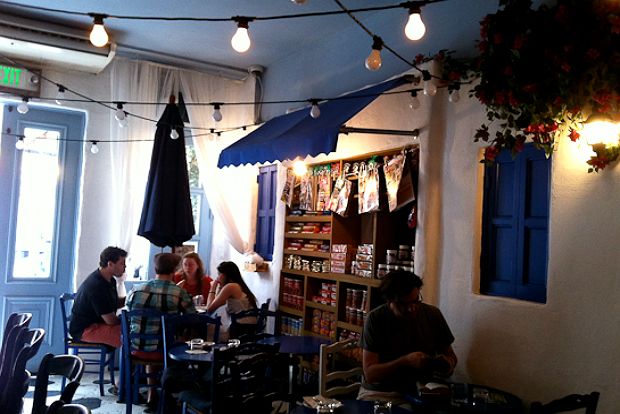 Mπλε τραπεζάκια, κατάλευκοι τοίχοι, ένα τάβλι και… μυρωδιές ελληνικές. Τζατζίκι, γύρος, πίτα και ουζάκι.
