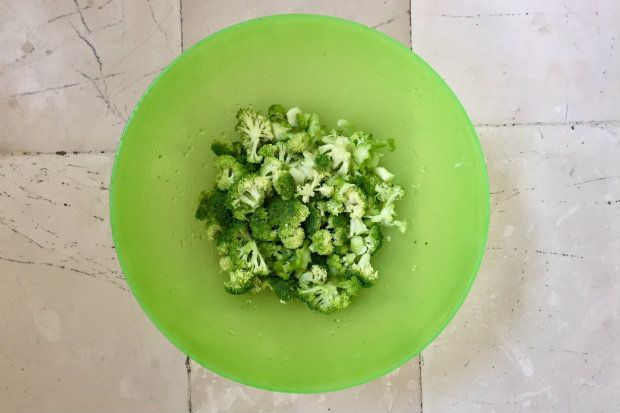 Χωρίζω το μπρόκολο σε πολύ μικρά μπουκετάκια και ρίχνω τα κομμάτια σε ένα μπολ με νερό και ξύδι (για να το καθαρίσω από τυχόν έντομα). Το σουρώνω και το ξεπλένω με καθαρό νερό και το βράζω για λίγο στον ατμό, τόσο ώστε να κρατάει.