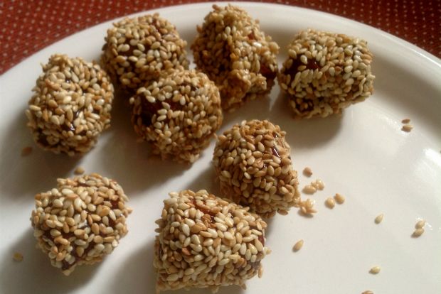 Τα σουρώνουμε και τα απλώνουμε σ’ ένα ταψί να στεγνώσουν. Πριν στεγνώσουν, κυλάμε καθένα μέσα στο σουσάμι να καλυφθεί πυκνά.