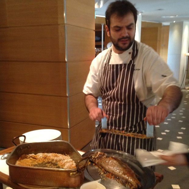 Τα φαγητά, που διαδέχονται το λυθρίνι πρόκειται να οδηγήσουν, σταδιακά, στην κορύφωση που έμελλε να είναι ένας ροφός γιουβέτσι. Αλλά τι ροφός; Τεράστιος, ζουμερός, που αριβάρει αχνιστός, μέσα σε ένα ρομβοειδές επιβλητικά χαλκο-κόκκινο μπακιρένιο σκεύος, λες και πόζαρε για φωτογράφιση σε περιοδικό γεύσης άλλων εποχών. Παρόλο που προοριζόταν για μας τον ζήλεψα, όπως ζήλεψα και τον σεφ, Περικλή Κοσκινά, όταν ήρθε με το βοηθητικό του τραπεζάκι (το λεγόμενο «guéridon de service») κι όλη την άνεση των κινήσεων του για να ανοίξει τον ψάρακα μπροστά μας και να μας σπάσει τη μύτη πριν καν γευτούμε την πρώτη μας μπουκιά. Οι πολιτικώς ορθώς κραυγούλες για το καρπάτσο δεν συγκρίνονται πια με τους αλαλαγμούς των μαινάδων με τους οποίους υποδεχτήκαμε το γιουβέτσι. Ένα κλικ πιο μεστός να ήταν ο ζωμός που έβρασε το κριθαράκι και θα έπαυα να το θεωρώ «ετούτου του κόσμου».