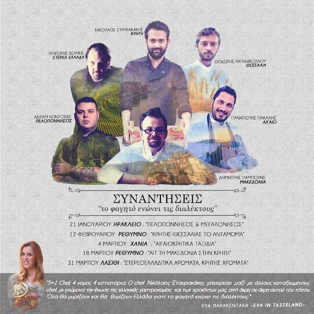 • 12 Φεβρουαρίου, στην “Avli” του Ρεθύμνου με τον Θοδωρή Παπανικολάου (εστιατόριο Σελήνη στη Σαντορίνη) δημιουργούν με κρητικά προϊόντα πιάτα εμπνευσμένα από την θεσσαλική κουζίνα.