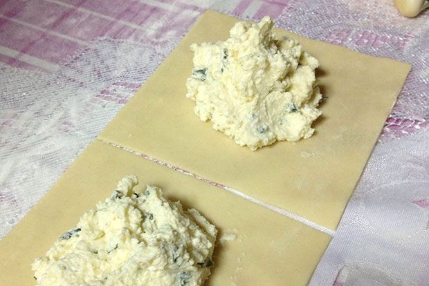 Εν τω μεταξύ ετοιμάζουμε τη γέμιση ανακατεύοντας όλα τα υλικά μαζί. Ανοίγουμε το φύλλο με τη μηχανή η το ξυλίκι. Θέλουμε να φτιάξουμε τετράγωνα μεγέθους 6Χ6 εκατοστών. Τοποθετούμε στη μέση μια κουταλιά γέμιση και τα κλείνουμε διπλώνοντας τις 4 άκρες στο κέντρο πιέζοντας λίγο τη γέμιση.