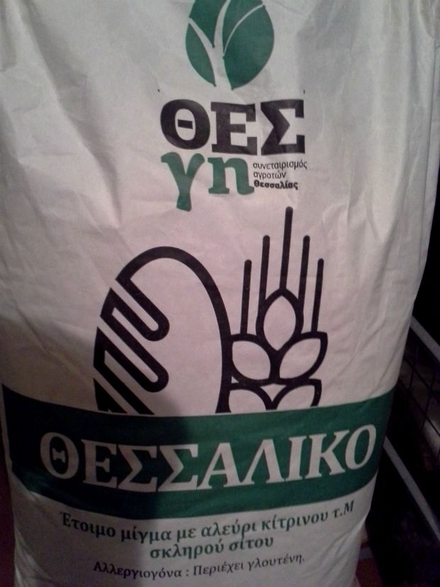 Αν υπάρχει ο θεός του βουνού (κι εγώ πιστεύω ότι υπάρχει), αυτός μας έφερε στην πόρτα μας την πρώτη ύλη που ονειρευόμαστε. Αλεύρι θεσσαλικό. Αλεύρι αλεσμένο σε πετρόμυλο και μάλιστα έτοιμο για χρήση σε δυο μείγματα όπως τα θέλαμε. Ένα χωριάτικο με λευκό και κίτρινο αλεύρι και ένα μαύρο με αλεύρι σίκαλης, κριθαριού και σταριού ολικής άλεσης. Παραγωγός ο συνεταιρισμός Θεσσαλών αγροτών ΘΕΣΓΗ. Ένας συνεταιρισμός με 64 μέλη αγρότες – παραγωγούς που αξιοποιούν 20.000 στρέμματα του Θεσσαλικού κάμπου.