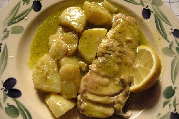 Σήμερα ζήτησα του Νίκου να μας ετοιμάσει ένα από τα ονομαστά του πιάτα, το κερκυραϊκό ψάρι «μπιάνκο» με φέτες σφυρίδα. Μου εξηγεί ότι γίνεται και με άλλα ψάρια, αρκεί να είναι λιπαρά.