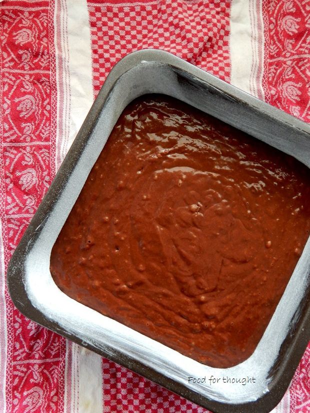 Προσθέτουμε το εκχύλισμα βανίλιας, το ξύσμα πορτοκαλιού, το λικέρ και το περιεχόμενο του μπολ με το αλεύρι. Ανακατεύουμε ώστε να δημιουργηθεί ένας σοκολατένιο χυλός που είναι η ζύμη του κέικ. Ρίχνουμε τον χυλό σε ένα τετράγωνο ταψάκι διαστάσεων 25×25 εκατοστών, το οποίο έχουμε προηγουμένως βουτυρώσει και αλευρώσει.