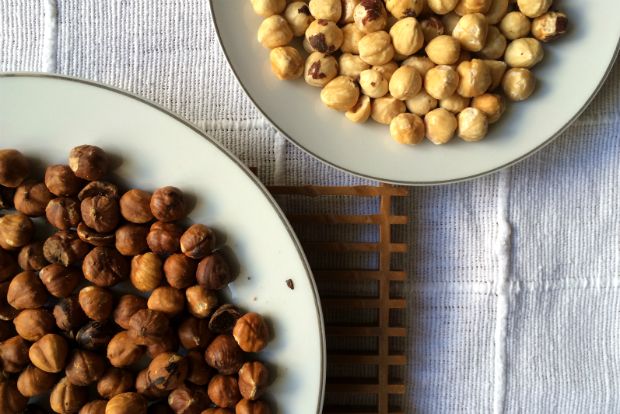 Ζέστανα τον φούρνο στους 180 βαθμούς και άδειασα τα φουντούκια σε ένα ρηχό ταψί. Μόλις ζεστάθηκε καλά, τα φούρνισα και άφησα να ψηθούν μέχρι να ροδίσουν, όχι να καούν· 10 λεπτά ήταν αρκετά. Τα άφησα να κρυώσουν (έκανα το λάθος να τα βγάλω στο μπαλκόνι και έτσι χάρισα ευχάριστες γευστικές στιγμές σε κάμποσα περιστέρια της γειτονιάς, οπότε προτιμήστε να τα αδειάσετε σε ένα ρηχό πιάτο κοντά σε ανοιχτό παράθυρο εντός σπιτιού). Σε όσα είχε μείνει λίγη φλούδα, την αφαίρεσα πανεύκολα τρίβοντας με μία πετσέτα.