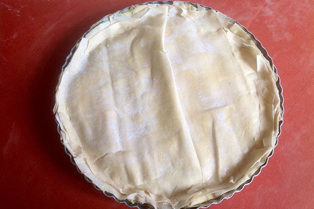 Σε μικρό στρογγυλό ταψί λαδωμένο απλώστε δύο στρώσεις φύλλο που να περισσεύει από απάνω, τη γέμιση και άλλες δύο στρώσεις φύλλο τσαλακωμένες (άρα μεγαλύτερες) αλειμμένες με ελάχιστο λάδι. Διπλώστε τις άκρες με λίγο νερό να κολλήσουν.