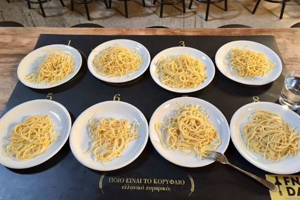 Δοκιμάστηκαν 8 διαφορετικά ελληνικά ζυμαρικά, αποκλειστικά σπαγγέτι Νο 7 και Νο 6, που ο μάγειρος του εστιατορίου τα έβρασε σύμφωνα με τις οδηγίες οι οποίες αναγράφονται στη συσκευασία του καθενός. Τα ζυμαρικά σερβιρίστηκαν σε πανομοιότυπα πιάτα χωρίς καμία σήμανση, σκέτα με ελάχιστο ελαιόλαδο. Και οι κριτές, χωρίς να γνωρίζουν την προέλευση του καθενός, βαθμολόγησαν κάθε πιάτο χωριστά ως προς την εμφάνιση και τη ζωντάνια του ζυμαρικού, την υφή (κατά πόσο ήταν al dente), το άρωμα και τη γεύση, τη φινέτσα του και την επίγευσή του σε μια κλίμακα από το 1 έως το 100.