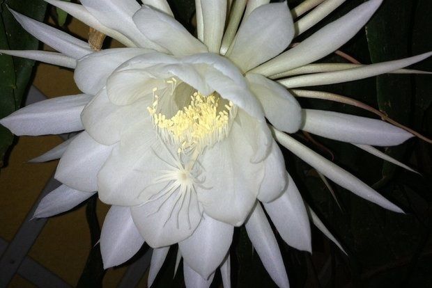 Το κακτοειδές αυτό επίφυλλο κατάγεται από τη Νότια Αμερική. Στο κλίμα μας επιζεί μεν αλλά με αραιή ανθοφορία, που το κάνει πιο ακριβοθώρητο. Σαν αποτέλεσμα η εμφάνιση του άνθους του, από μία έως τρεις φορές κάθε καλοκαίρι, αποτελεί γεγονός. Το φυτό βγάζει όλα τα μπουμπούκια μαζί. Το δικό μας είχε 12 την περασμένη εβδομάδα και άνθισαν διαδοχικά τρεις συνεχόμενες νύχτες. Η μία έτυχε να έχει πανσέληνο και να έχω καλέσει φίλους. Κανείς τους δεν είχε δει ανθισμένο το φυτό αυτό. Όλο το βράδυ πηγαινοερχόμασταν παρακολουθώντας σαν σήριαλ την εξέλιξη του από μπουμπούκι (στις 9 μ.μ.) έως ολάνοιχτο (κατά τις 11.30 μ.μ). Παίρναμε φωτογραφίες και το συζητούσαμε.